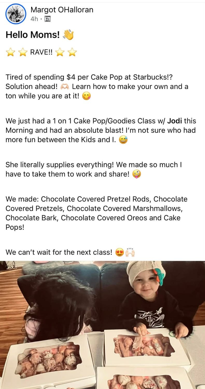 We just had a 1-1 Cake Pop Class with Jodi this morning and had an absolute Blast!!! I'm not sure who had more fun between the kids and I. Jodi brought everything! We made so much I have to take them to work to share. ~ MARGOT OHALLORAN - Turlock Mom