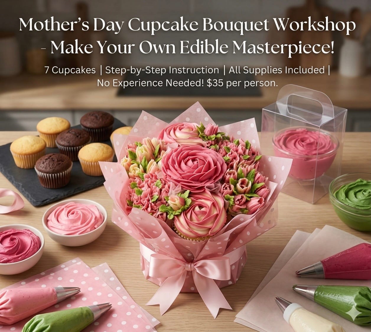 You will each learn the professional techniques to transform 7 delicious cupcakes into a stunning, hand-tied "edible arrangement" featuring realistic roses and tulips.